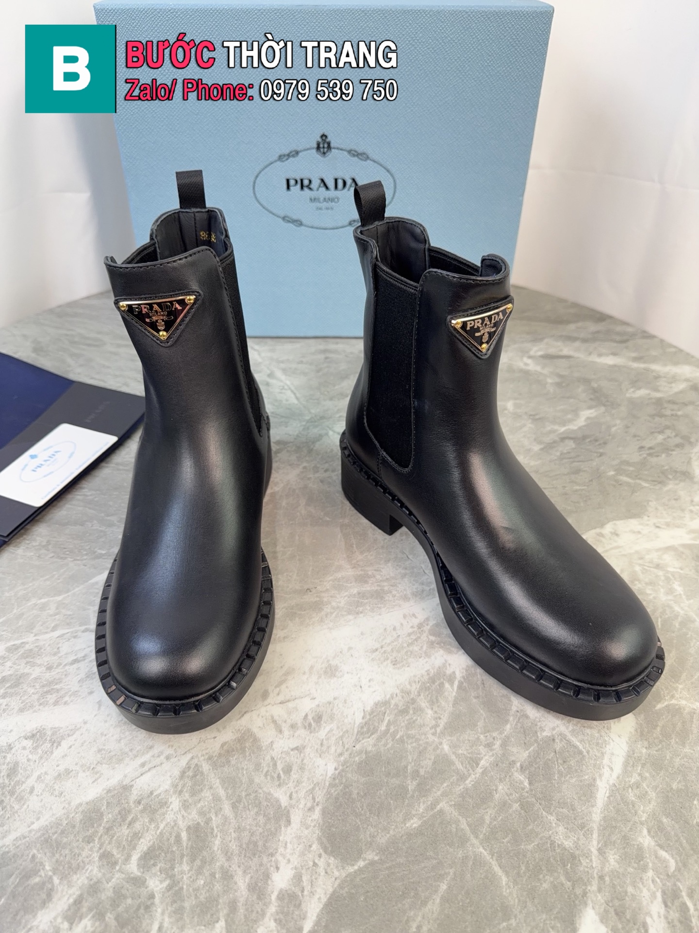 Boot da PRADA cổ chun ngắn cao cấp màu đen da bò sang trọng ấm áp