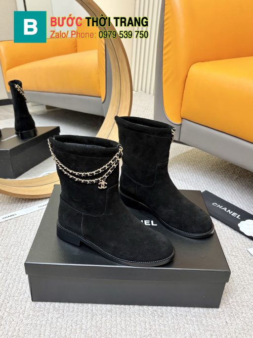 Bốt Chanel đế thấp cổ rộng màu đen da lộn sang trọng