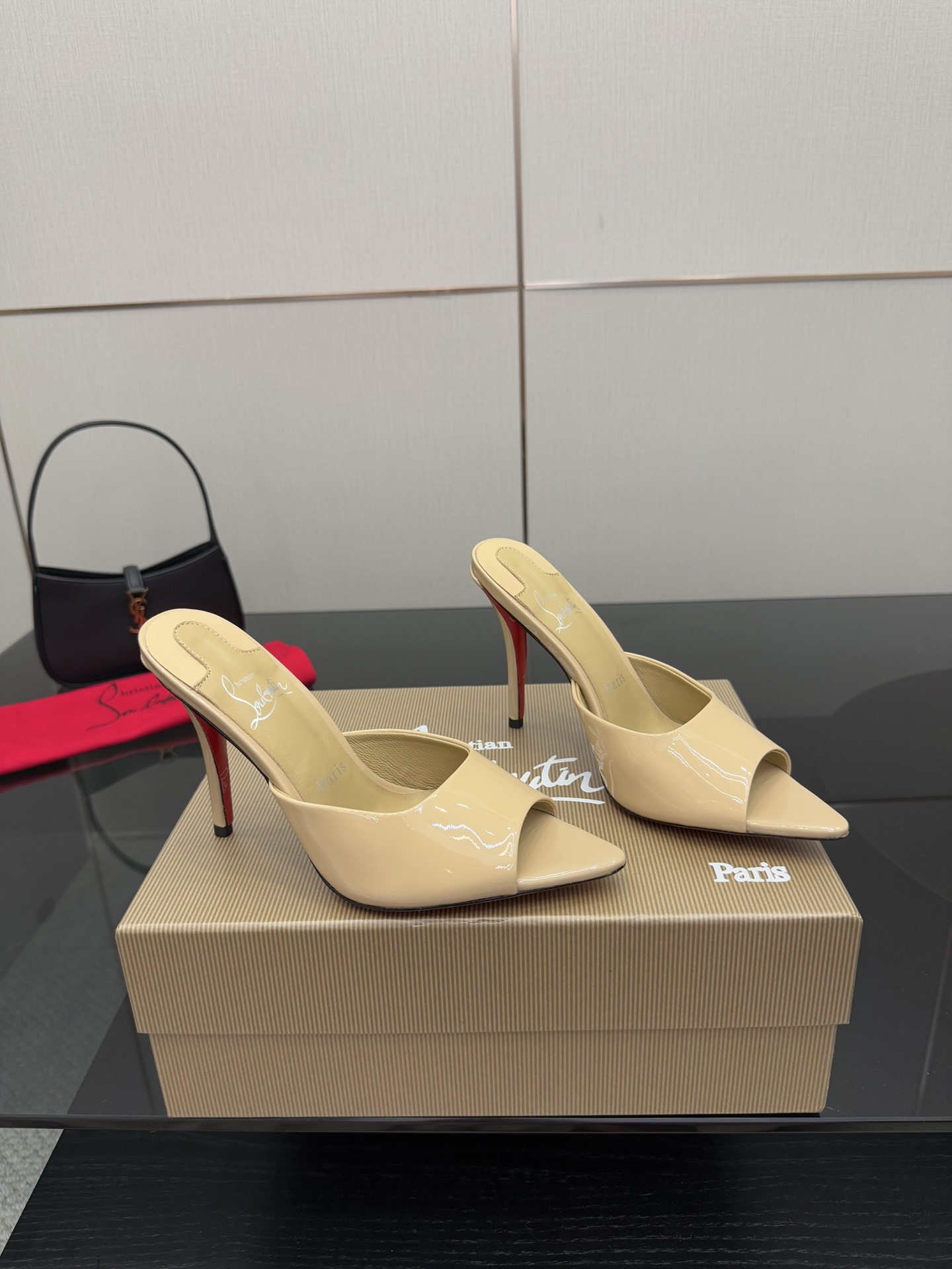 Dép cao gót Christian Louboutin màu be da bóng cao cấp mũi nhọn cao 10cm