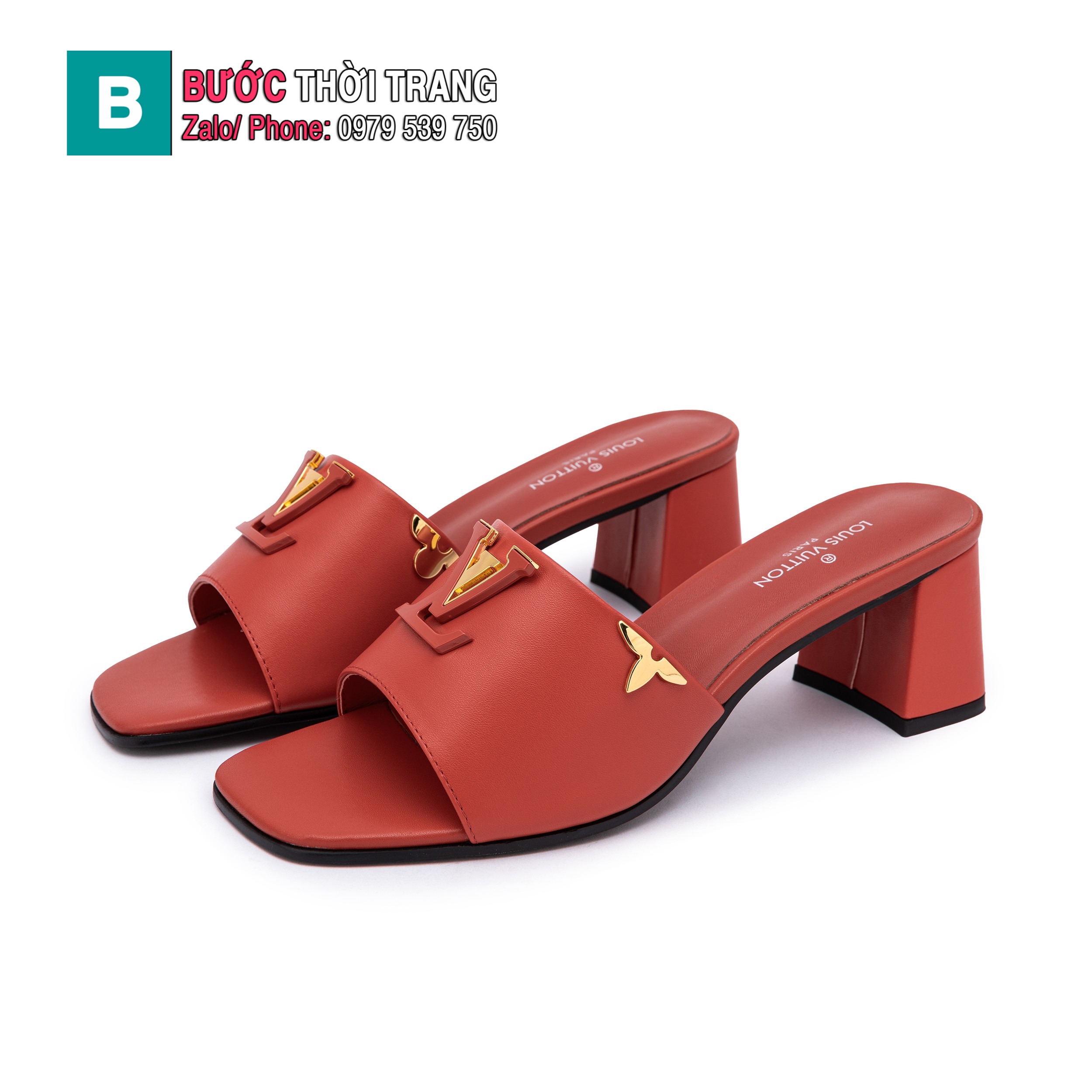 Dép cao gót LV màu đỏ cam đế vuông phong cách sang trọng
