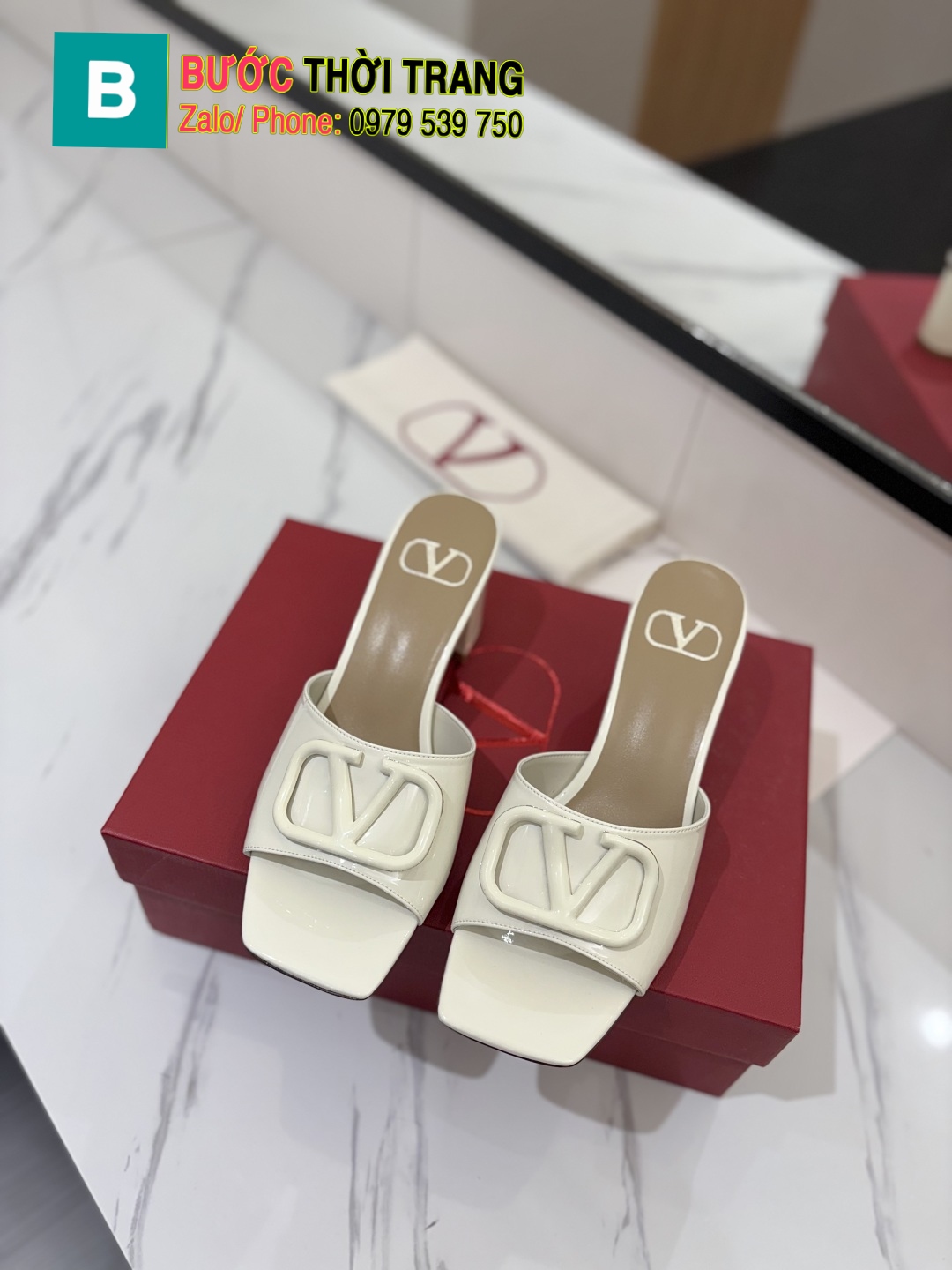 Dép cao gót Valentino màu trắng ngà chất da mềm đanh, dép cao 6cm