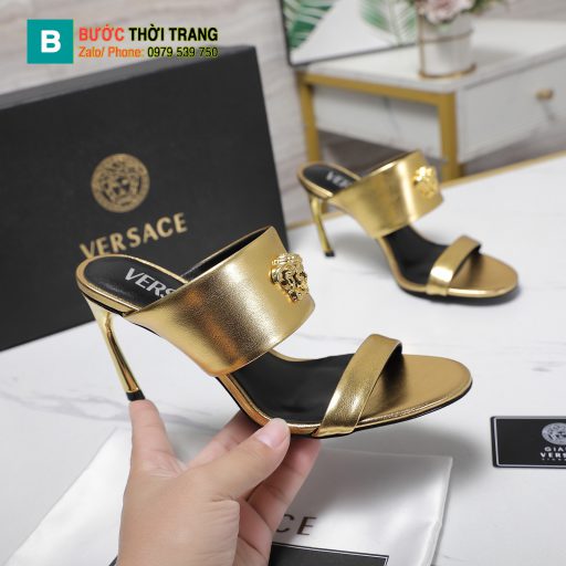 Dép cao gót Versace siêu cấp gót nhỏ màu vàng cao 8,5cm logo nổi bật