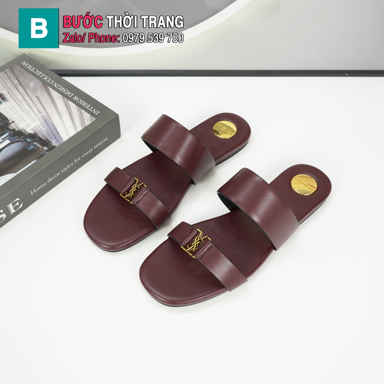 Dép da nữ YSL 2 quai đế bệt màu nâu socola chất liệu da bê cao cấp