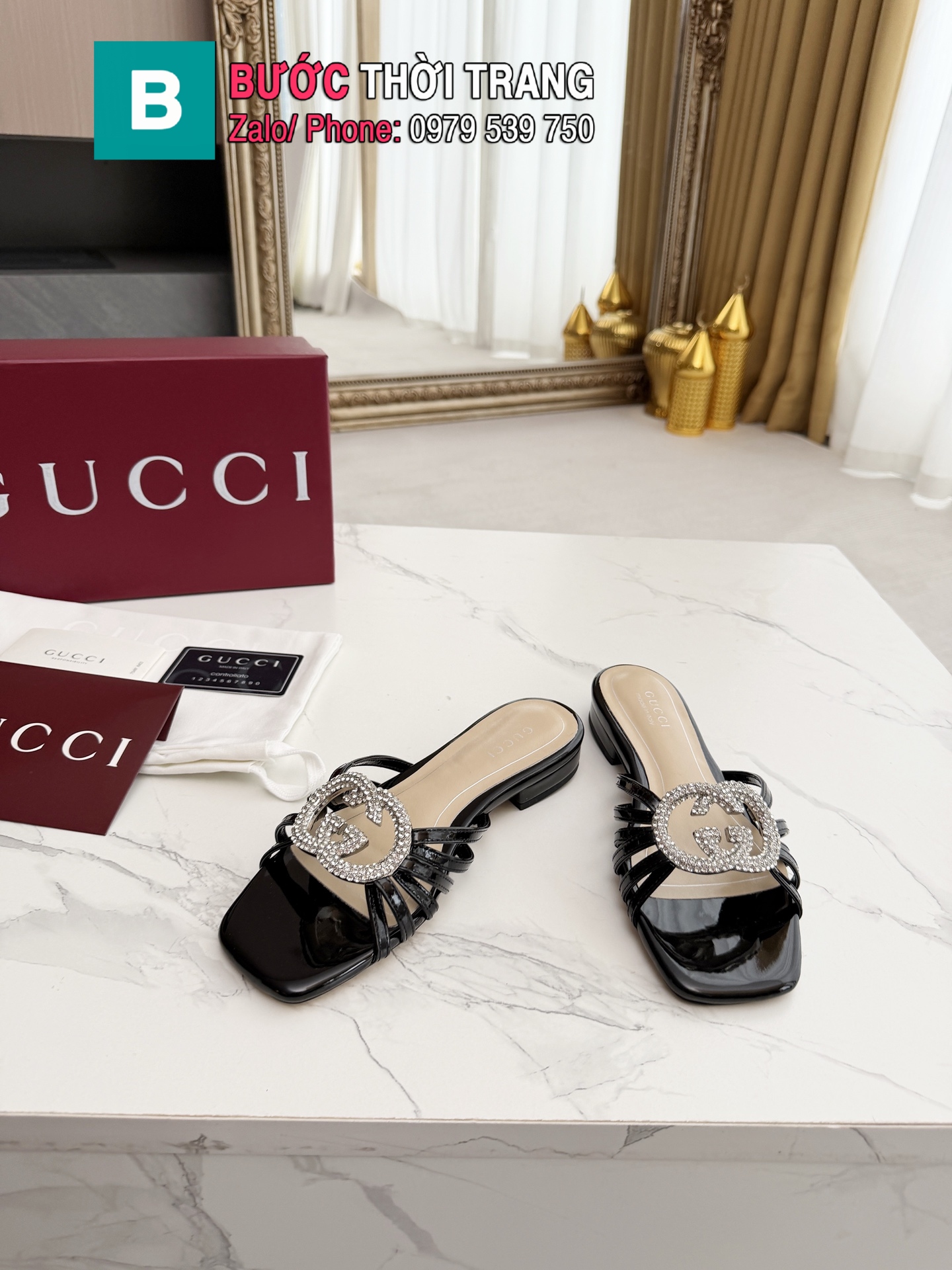 Dép GUCCI nữ đế bệt màu đen đính ngọc lấp lánh