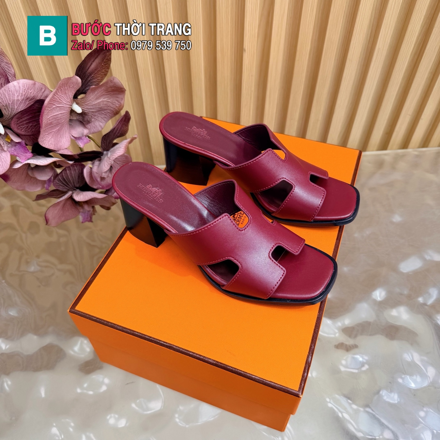 Dép HM chữ H cổ điển màu đỏ mận chất liệu da bò cao cấp đế 5cm