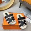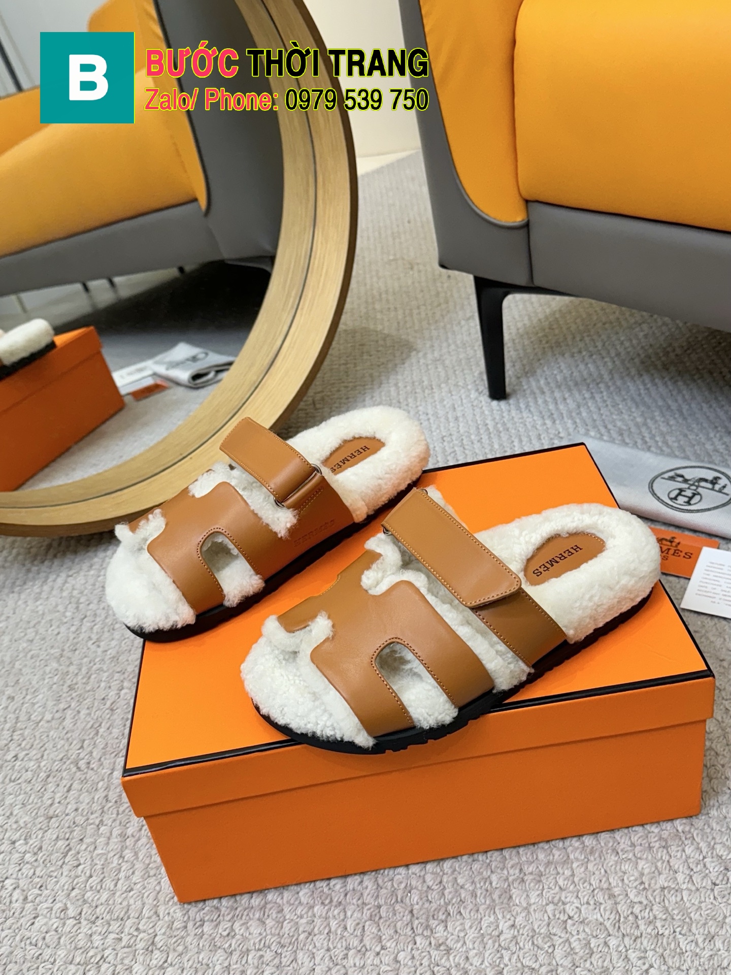 Dép lông Hermes mềm êm ấm áp, quai nâu sang trọng