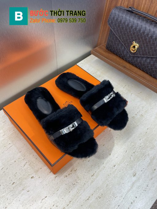 Dép lông Hermes siêu cấp màu đen mềm mượt logo màu bạc sang trọng