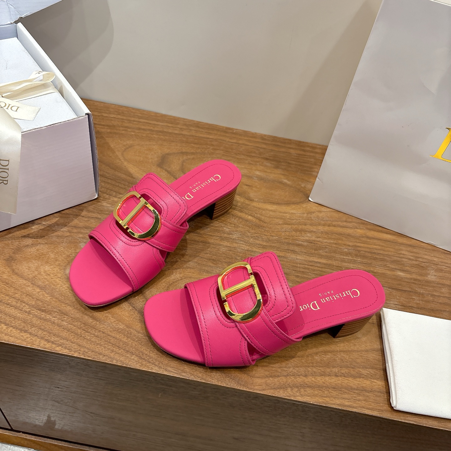 Dép nữ Dior màu hồng chất liệu da bò cao cấp đế cao 4,5cm