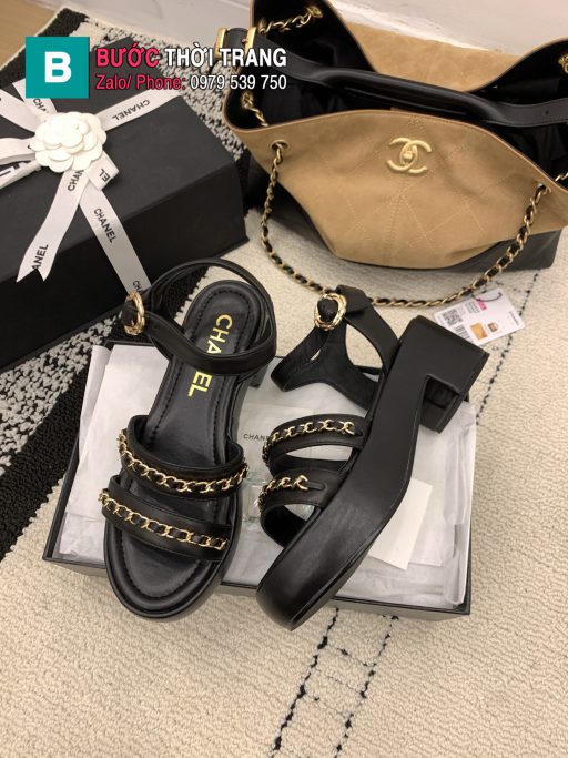 Dép sandal Chanel màu đen đế cao tôn dáng logo nổi bật