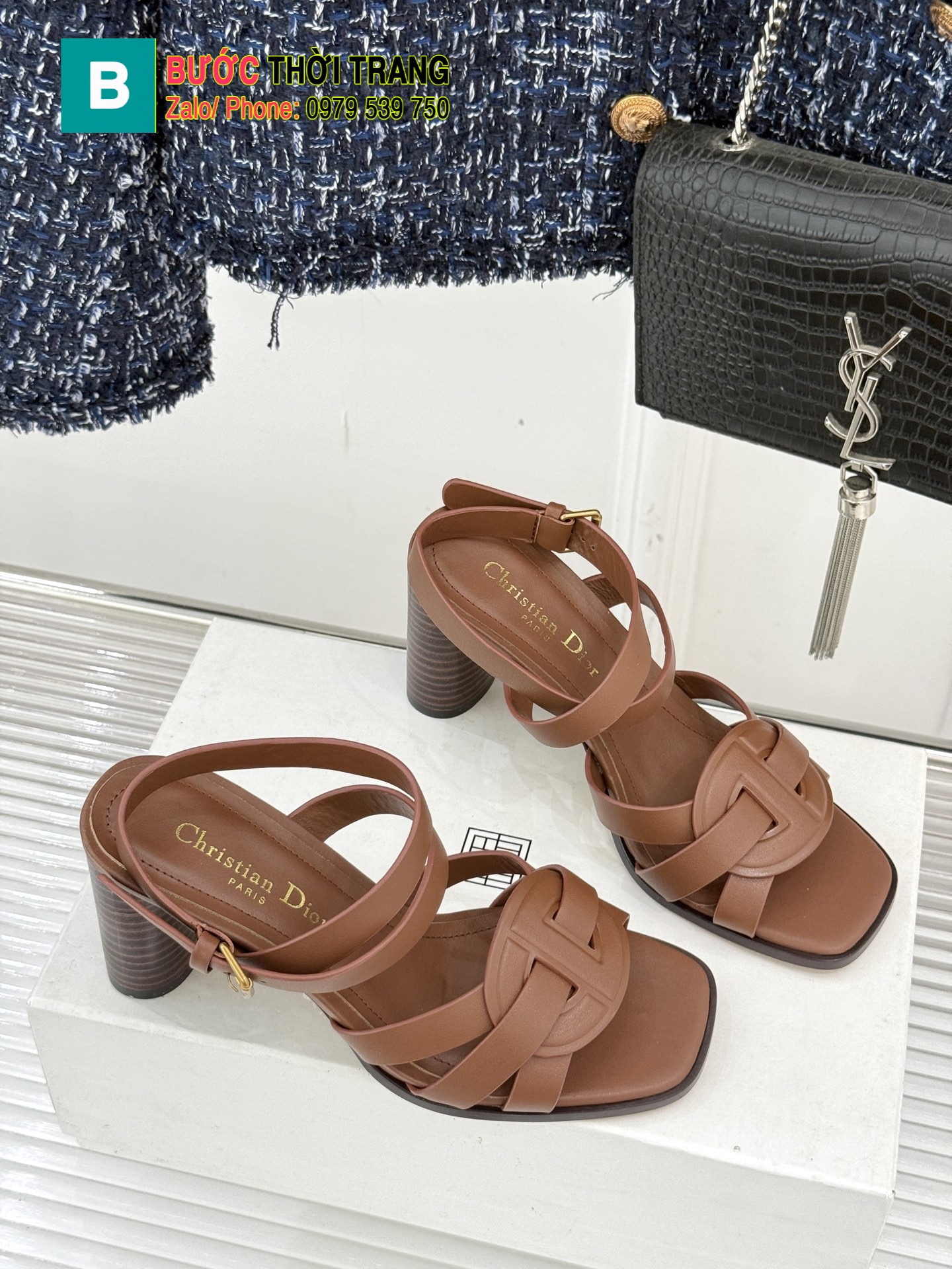 Dép xăng đan Dior cao gót màu nâu chất da bò mềm đanh cực đẹp, đế cao 8 cm