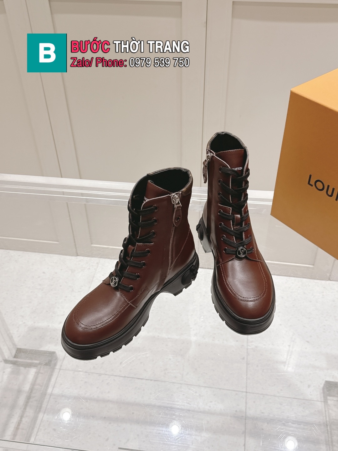 Giày boot LV cao cấp màu nâu cổ cao vừa chế tác từ da bê hạt mịn phong cách cá tính