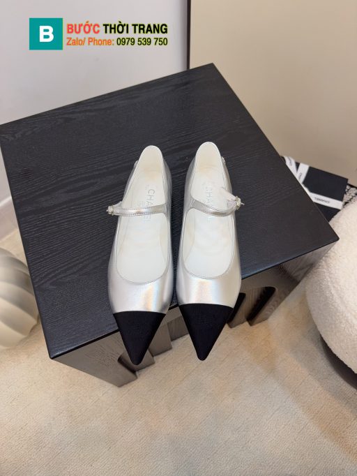 Giày búp bê Chanel đế bệt cao cấp màu bạc mũi nhọn màu đen thanh lịch