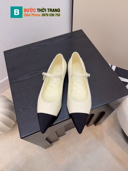 Giày búp bê Chanel đế bệt cao cấp màu trắng ngà mũi nhọn màu đen thanh lịch