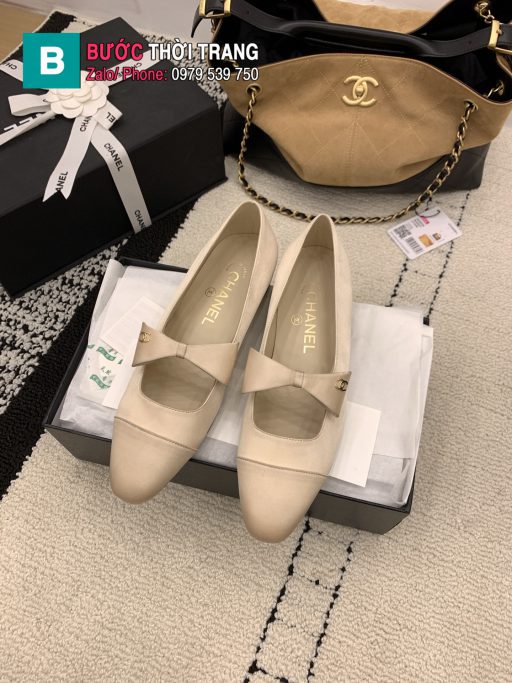 Giày búp bê Chanel đế bệt màu be đính nơ xinh xắn mũi tròn dài phong cách