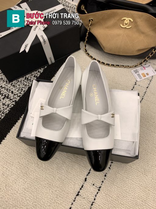 Giày búp bê Chanel đế bệt màu trắng đính nơ xinh xắn mũi tròn dài phong cách