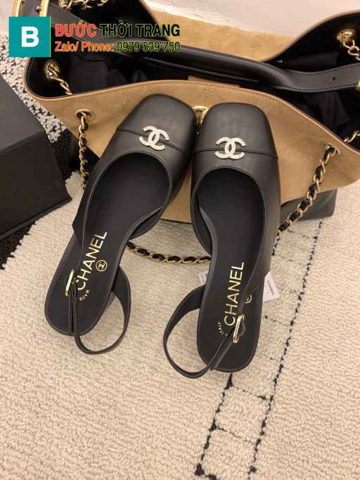 Giày búp bê Chanel hở gót màu đen mũi vuông đế cao chắc chắn logo đính ngọc lấp lánh
