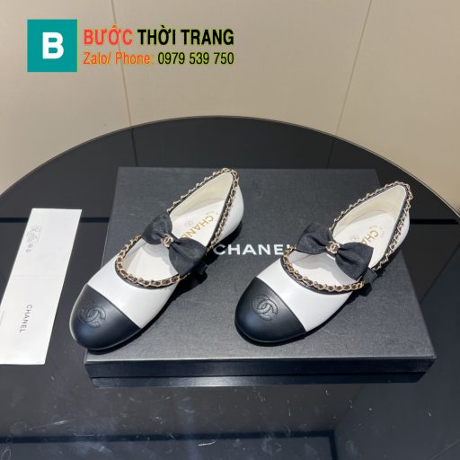 Giày búp bê nữ Chanel màu trắng đen siêu cấp họa tiết dây nơ xinh xắn