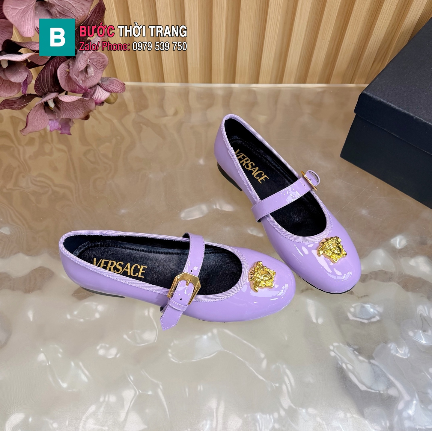 Giày búp bê nữ VERSACE màu tím da bóng mềm logo mũi giày nổi bật