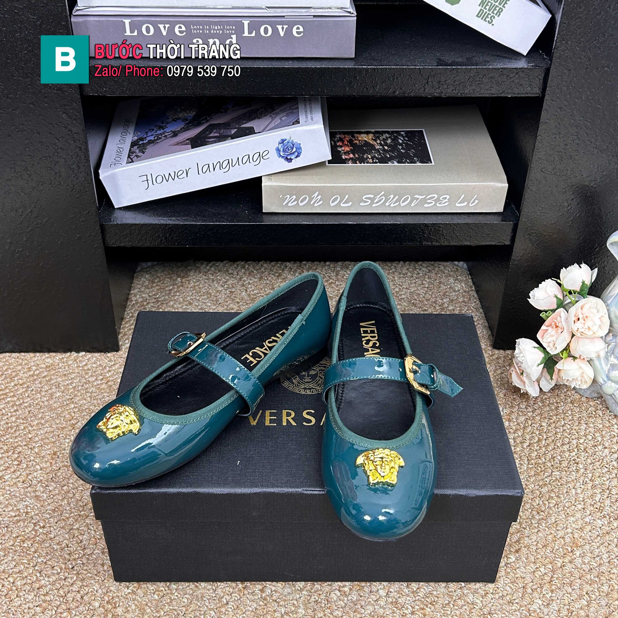 Giày búp bê nữ VERSACE màu xanh da bóng mượt đế bệt nữ tính