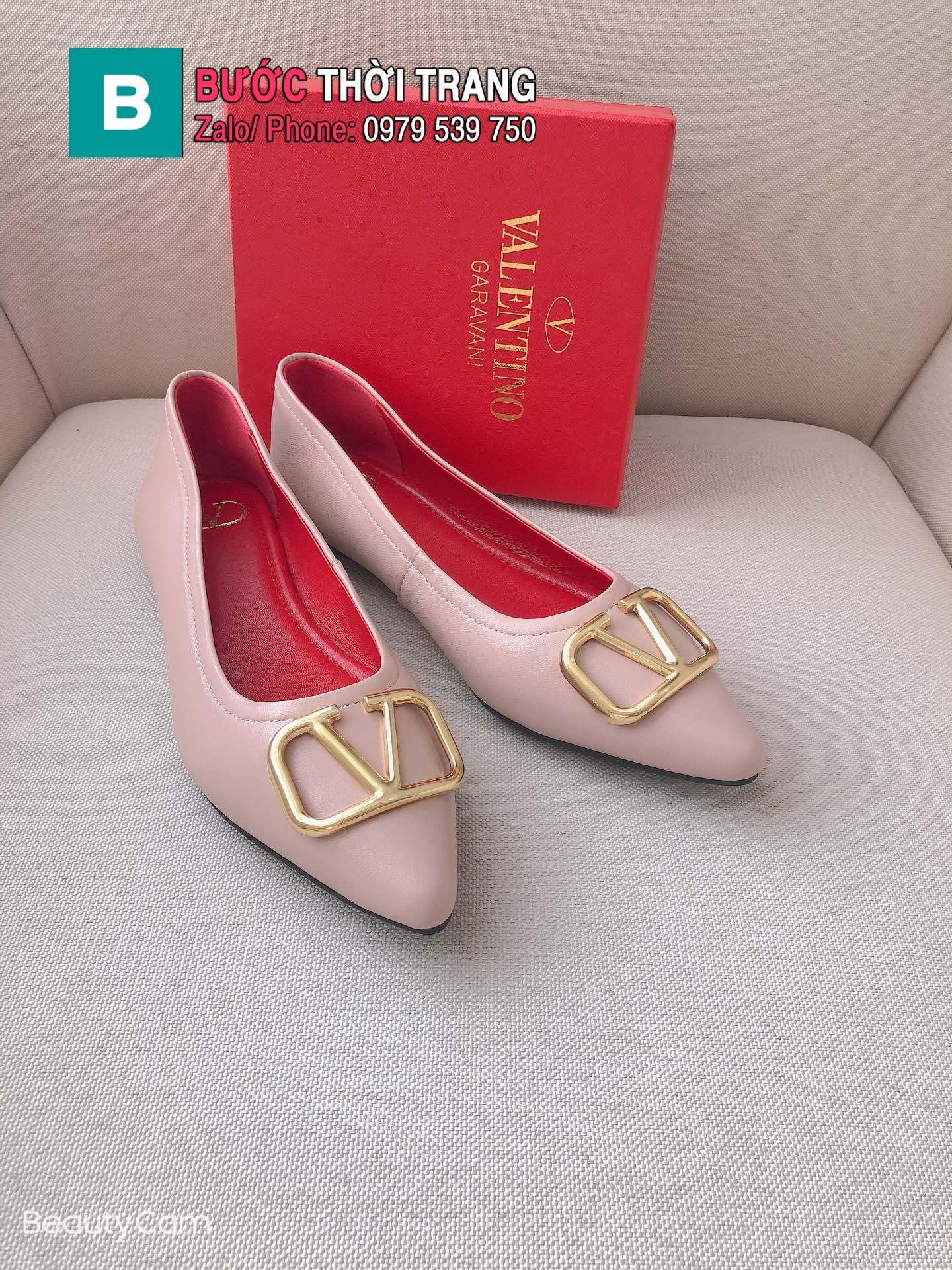 Giày búp bê VALENTINO màu nude hồng đế đỏ làm từ da cừu mềm dẻo logo vàng sáng nổi bật
