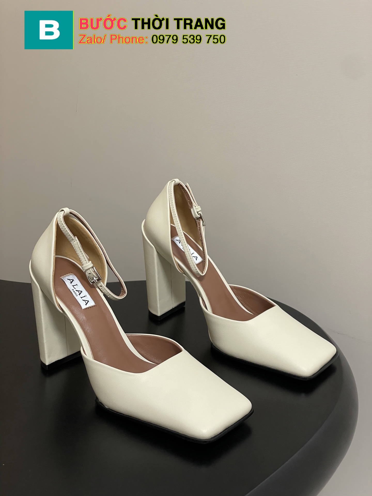 Giày cao gót ALAIA màu trắng ngà mũi vuông sang trọng, đế cao 10 cm