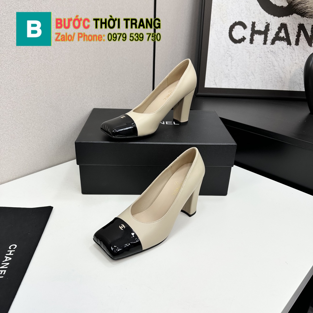 Giày cao gót CHANEL màu be mũi vuông bóng rất đẹp chất da bò cao cấp