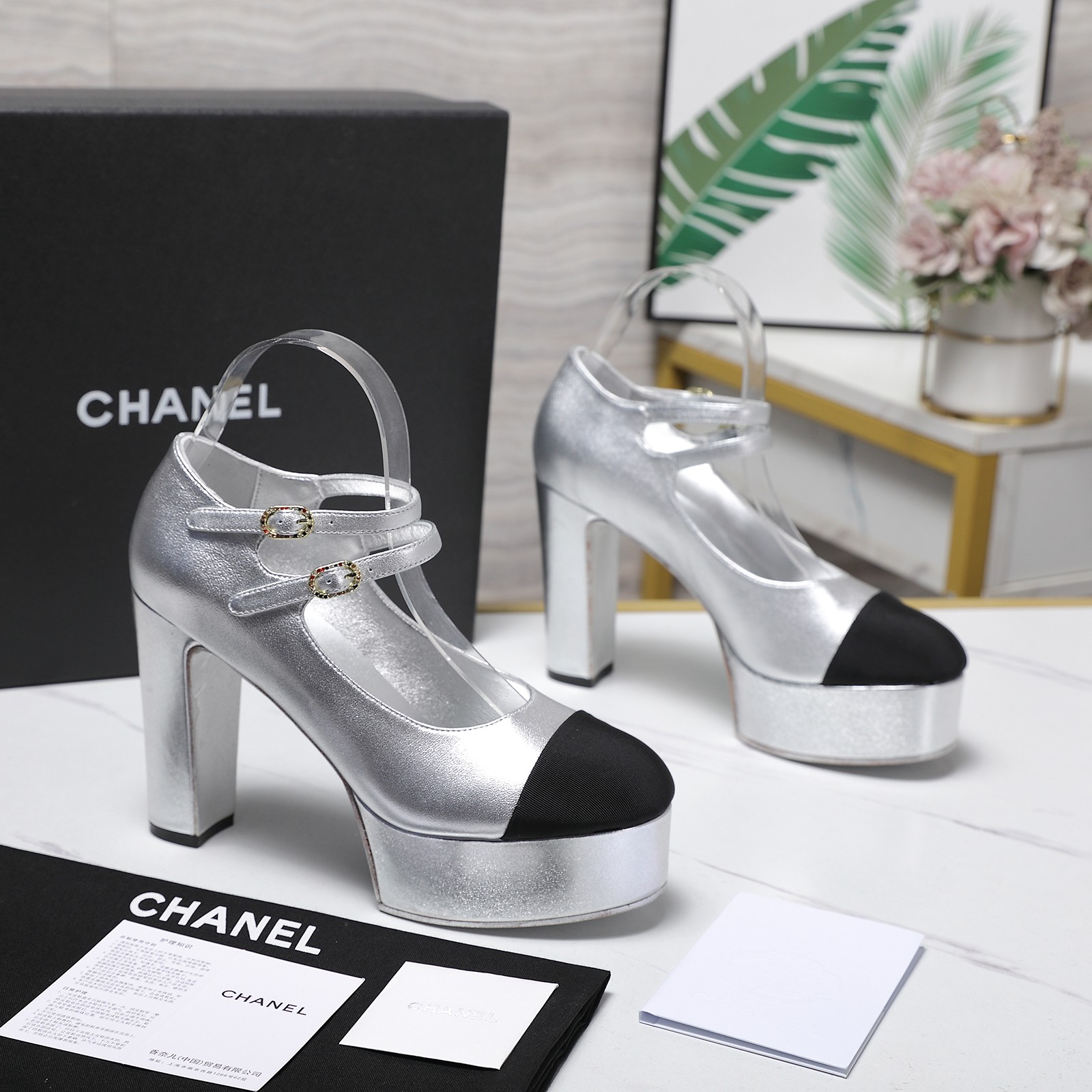 Giày cao gót CN màu bạc mũi đen da bò cao cấp đế cao 11 cm