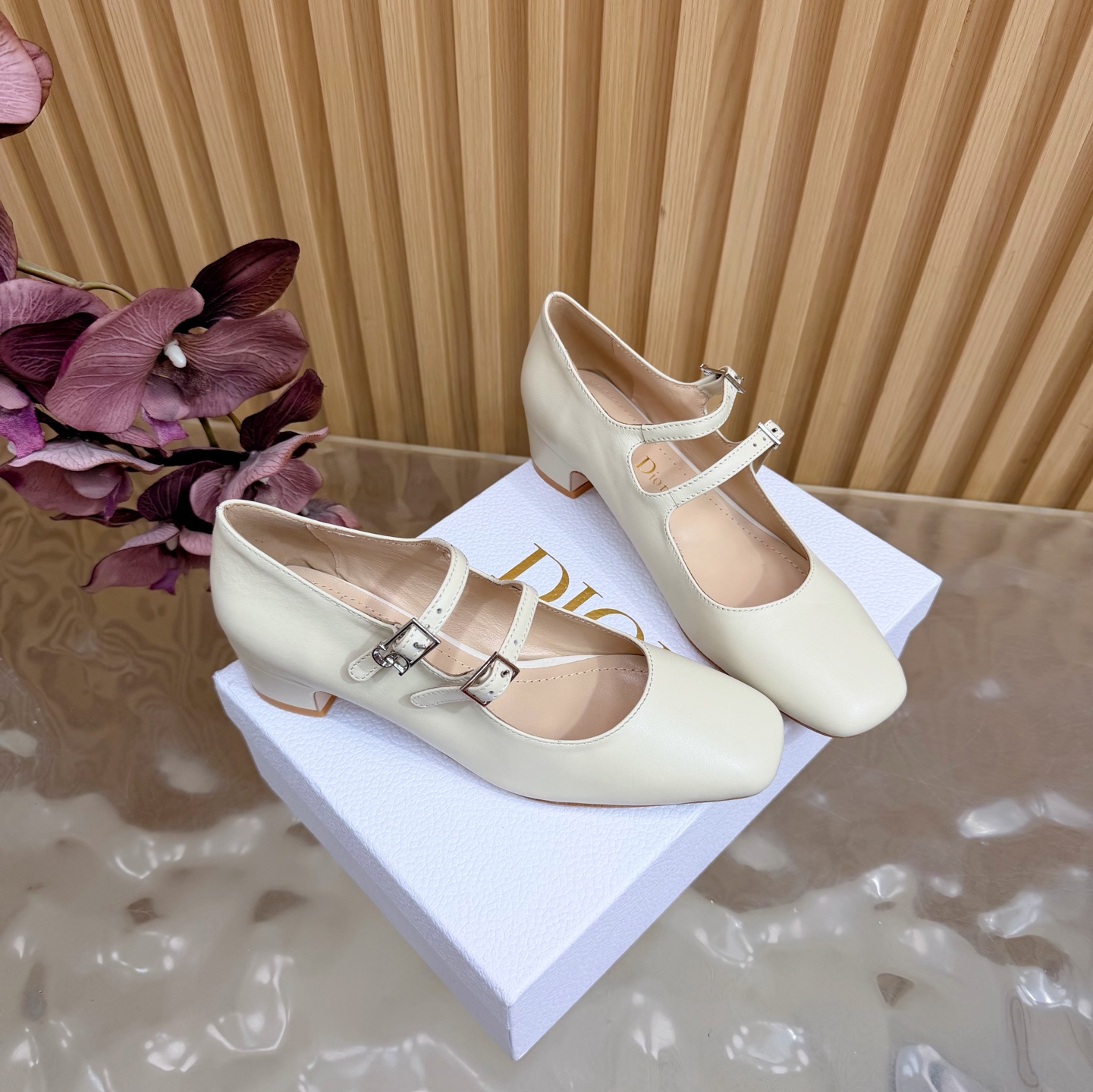 Giày cao gót DIOR 2 quai màu nude da lì thanh lịch