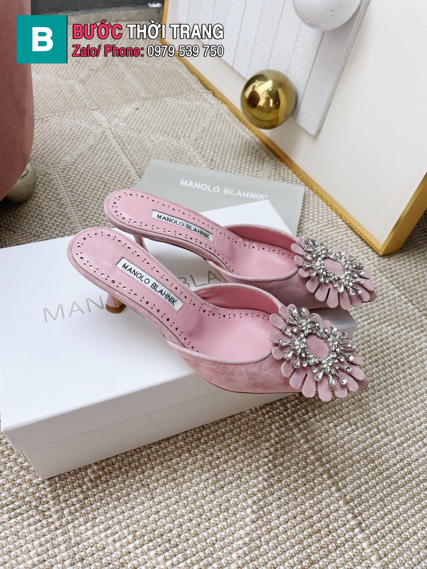 Giày cao gót MANOLO BLAHNlK mũi nhọn màu hồng cao cấp đính ngọc lấp lánh đế cao 5cm