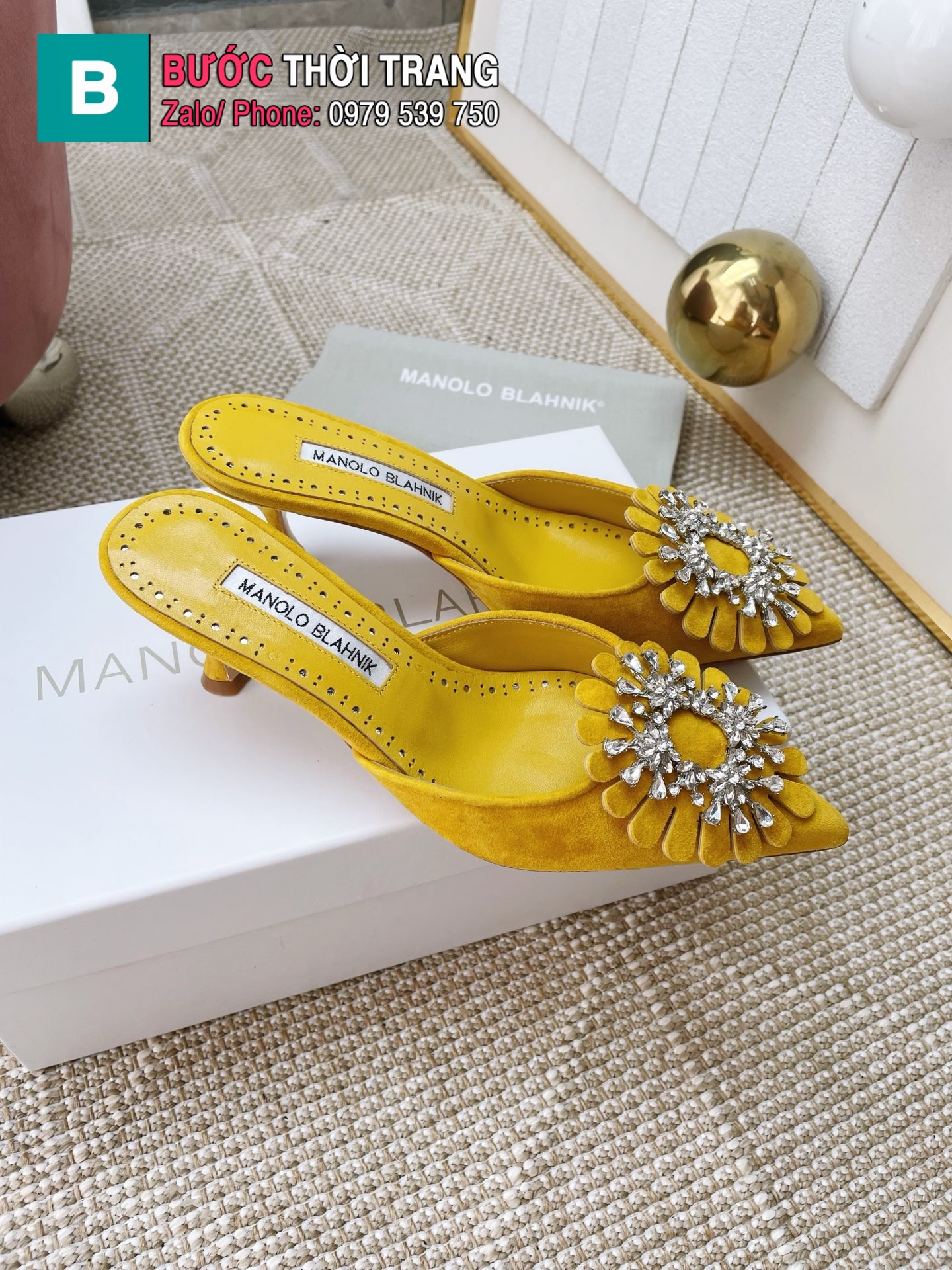Giày cao gót MANOLO BLAHNlK mũi nhọn màu vàng cao cấp đính ngọc lấp lánh đế cao 5cm