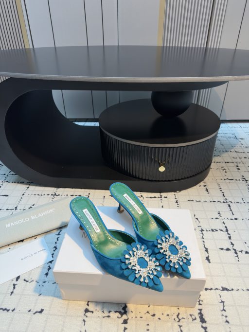Giày cao gót nữ Manolo Blahnik siêu cấp màu xanh đính ngọc lấp lánh đế cao 5cm