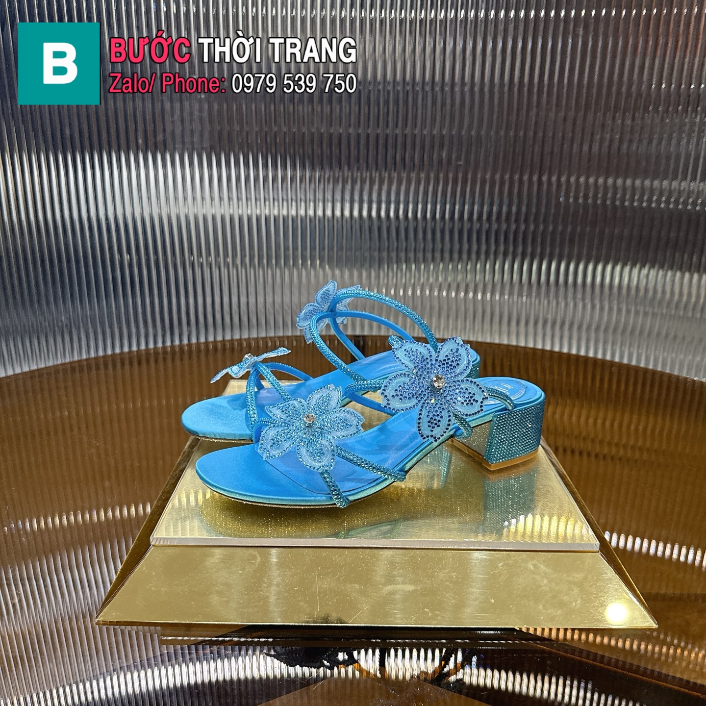 Giày cao gót Rene caovilla màu xanh đính hoa và hạt sang trọng cao 4.5cm