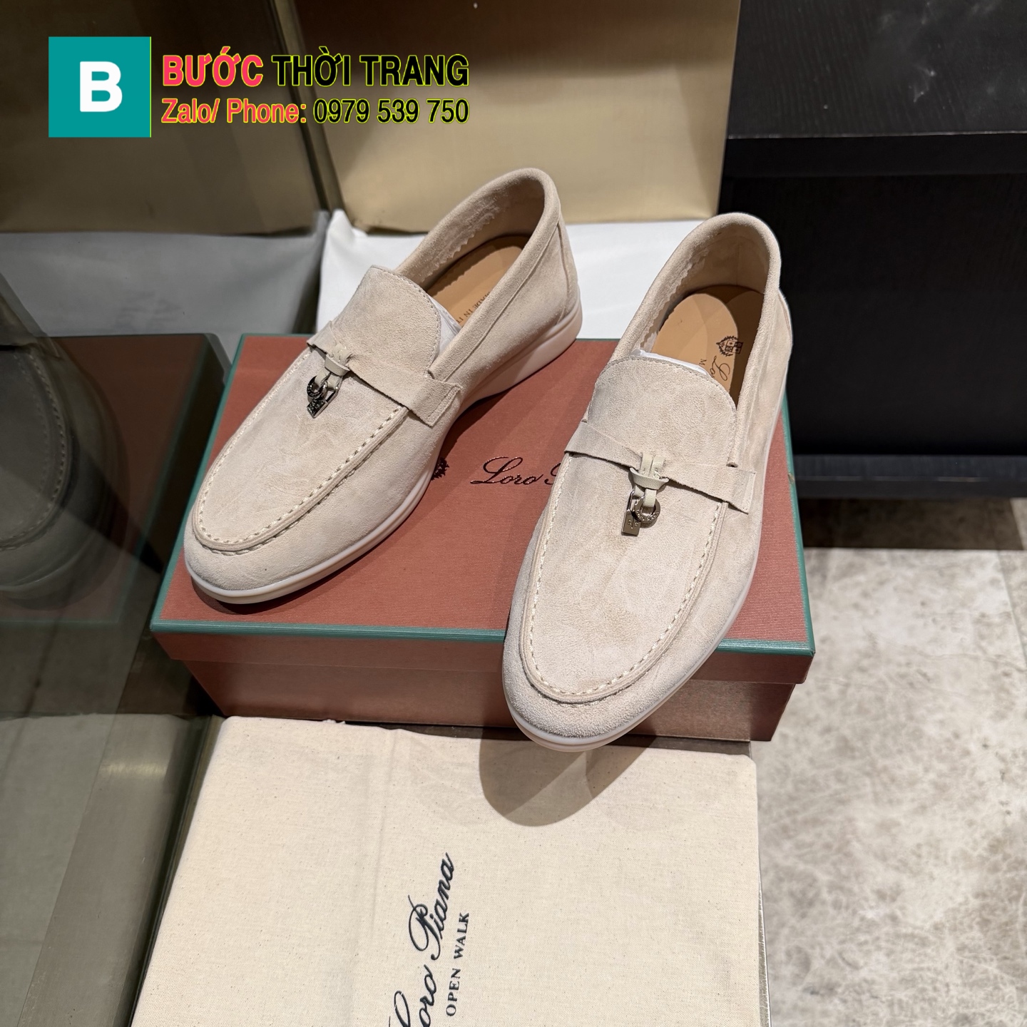Giày lười Loro Piana da lộn sang trọng màu nude phong cách unisex