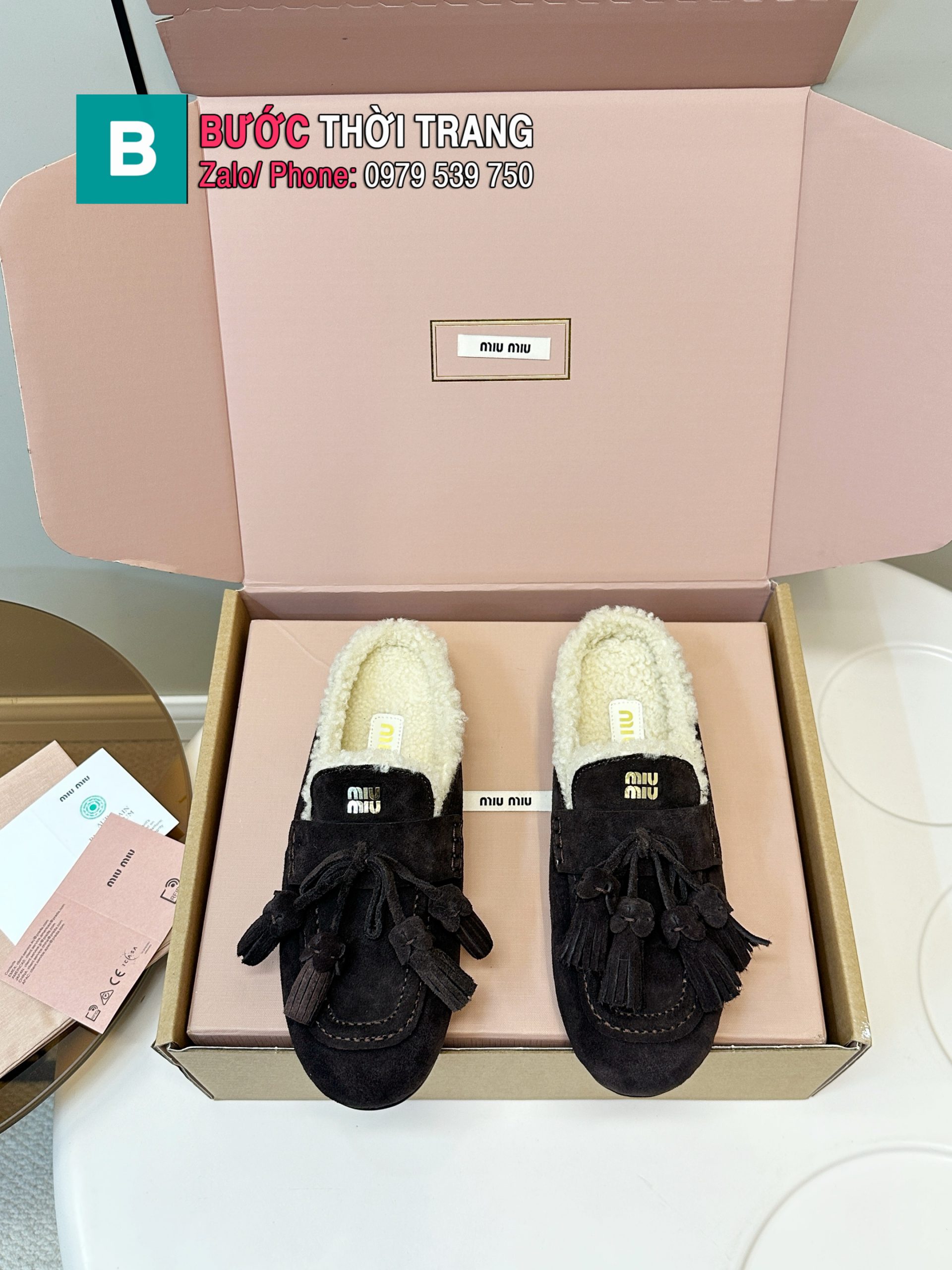 Giày lười MIU*MIU màu đen lót lông ấm áp họa tiết tua rua thêm sinh động