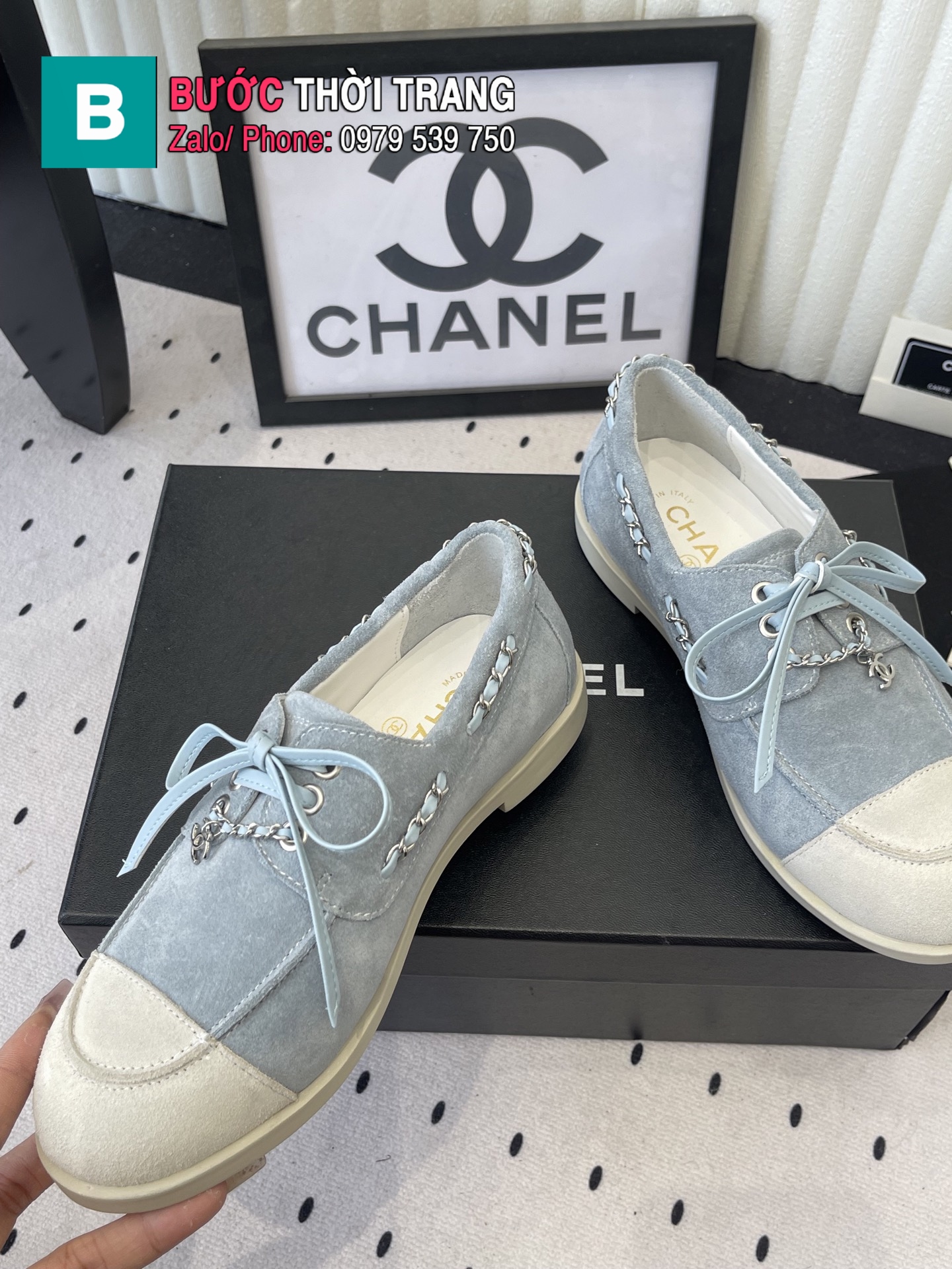 Giày lười nữ CN màu xanh mũi tròn thiết kế dây xích mới nhất