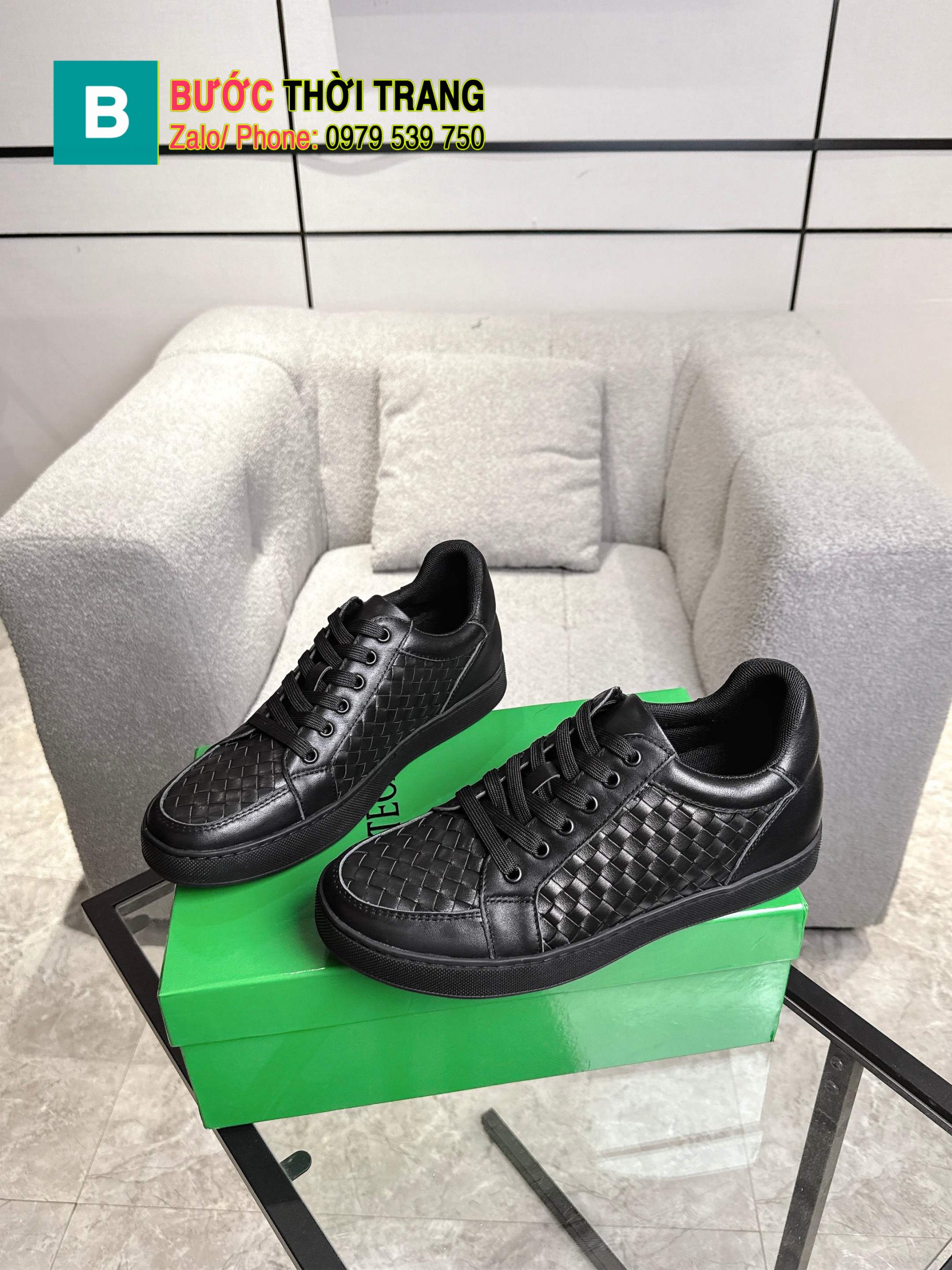Giày thể thao Bottega Veneta cao cấp màu đen họa tiết đan da thủ công đặc trưng và phong cách sang trọng