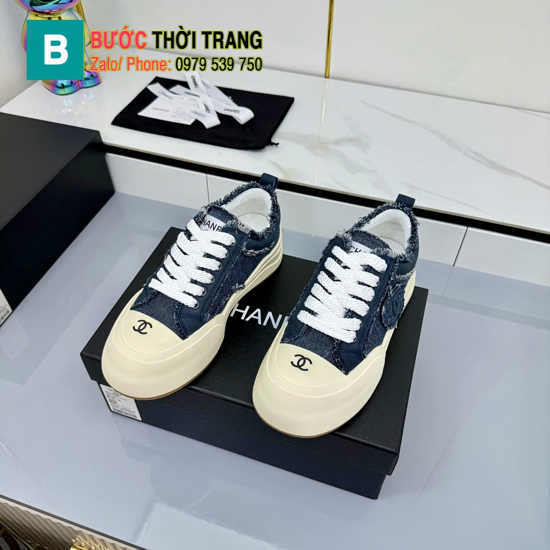 Giày thể thao Chanel màu xanh đậm, chất liệu vải denim cá tính giày đế cao logo nổi bật