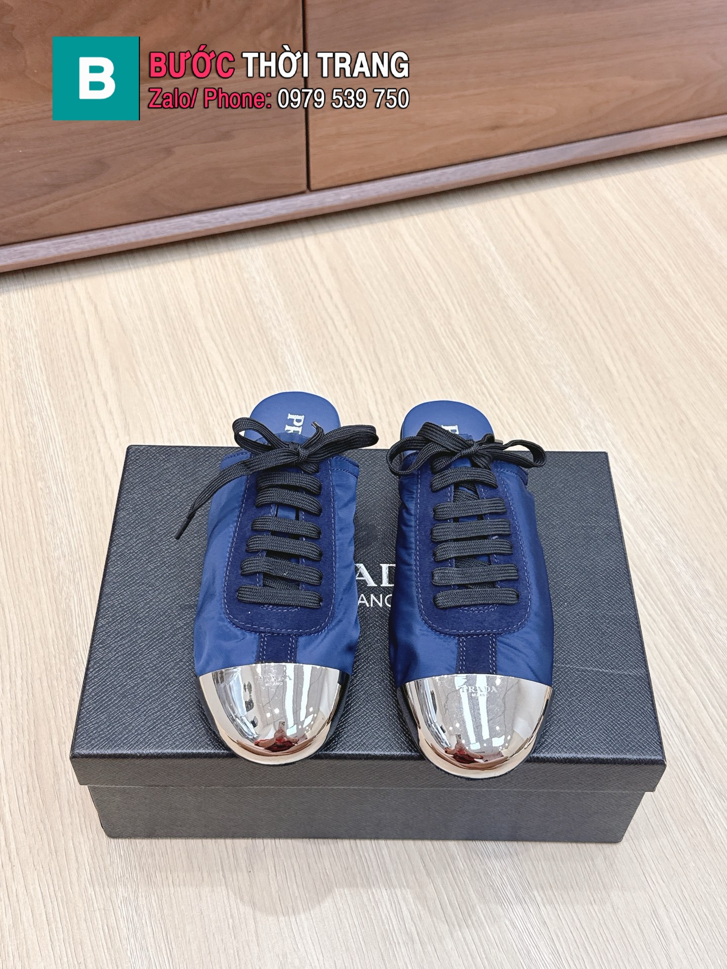 Giày thể thao đế mỏng mũi kim loại Prada màu xanh navy da bò cao cấp
