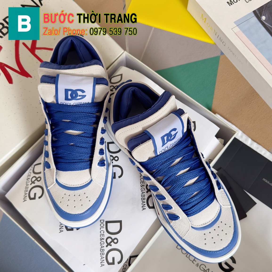 Giày thể thao LOEWE màu trắng kết hợp xanh navy da bò thật cao cấp đế cao 3,5cm, đế cao su chống trượt bền bỉ