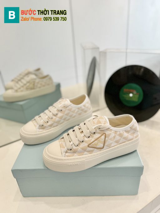 Giày thể thao Prada màu be họa tiết tam giác đan xen bắt mắt đế trắng cao 3cm