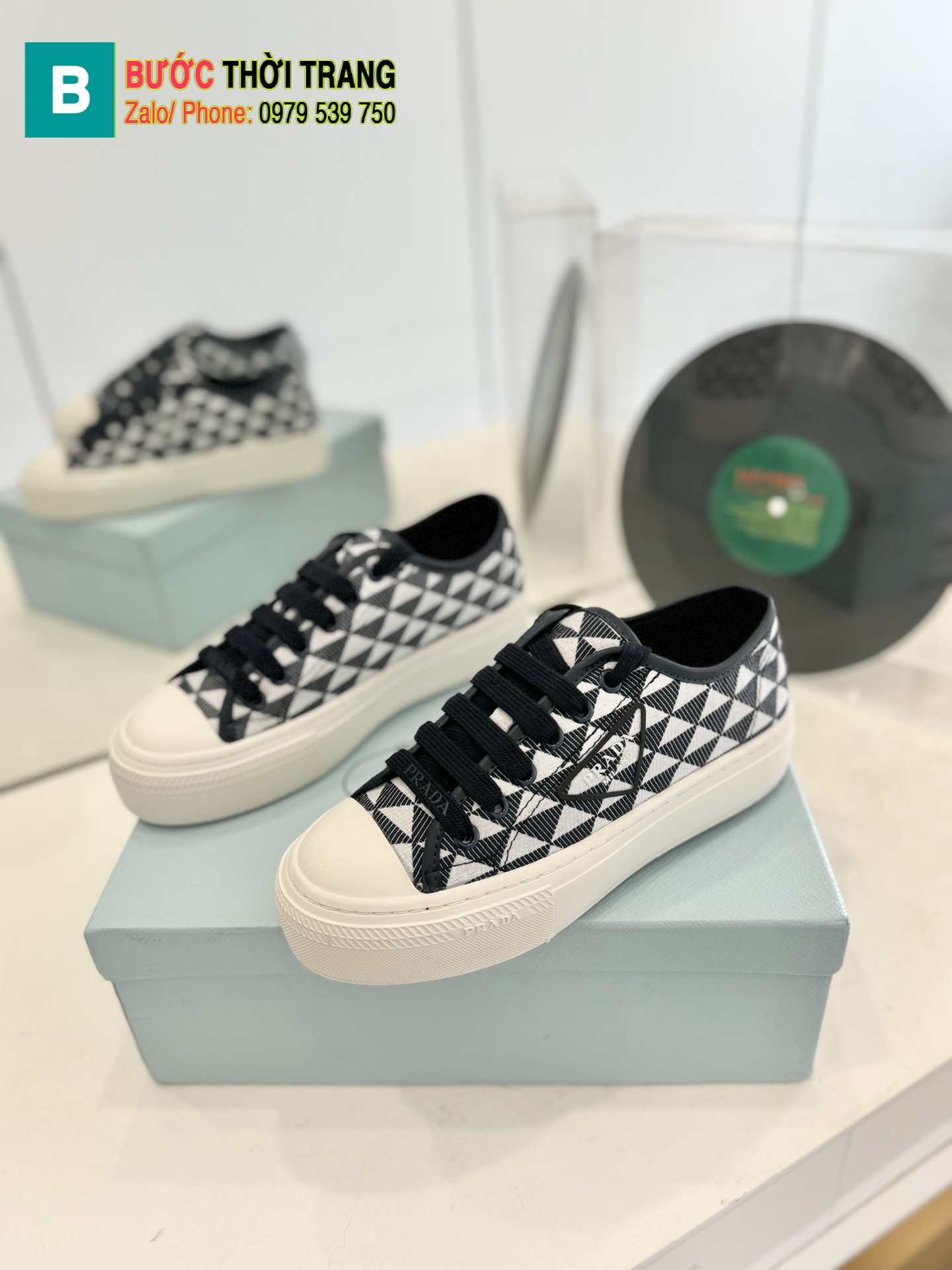 Giày thể thao Prada màu đen trắng họa tiết tam giác đan xen bắt mắt đế trắng cao 3cm