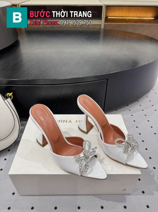 Guốc cao gót Amina Muaddi màu trắng chất da bóng mũi nhọn cao 9.5cm
