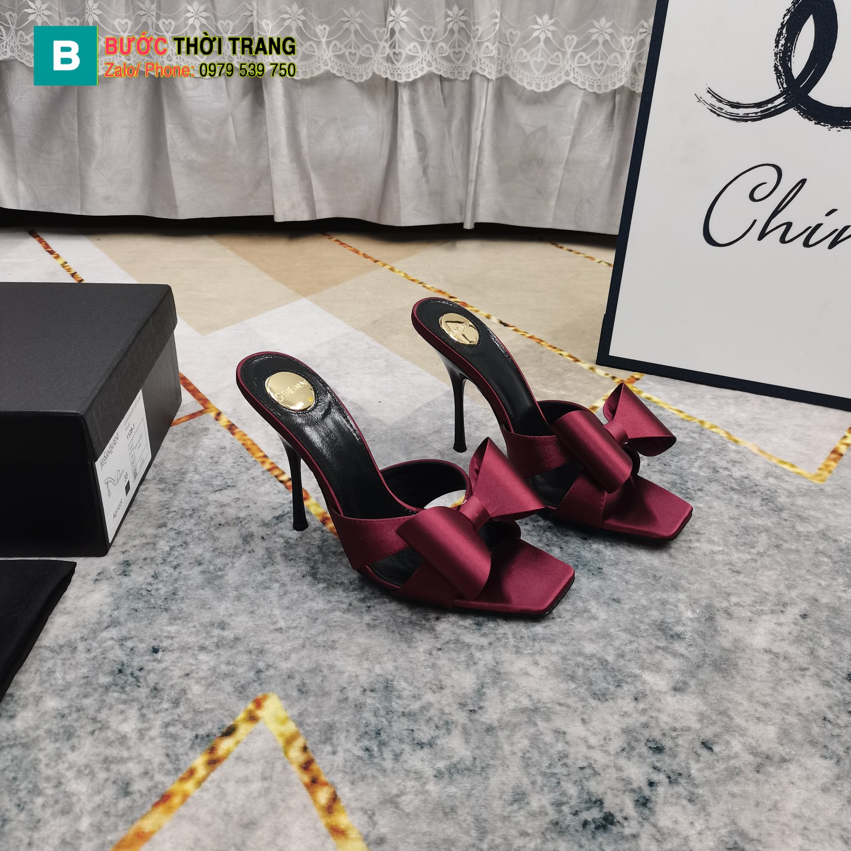 Guốc cao gót YSL màu đỏ nhung sang trọng quai nơ xinh xắn đế nhỏ thanh lịch cao 10,5cm