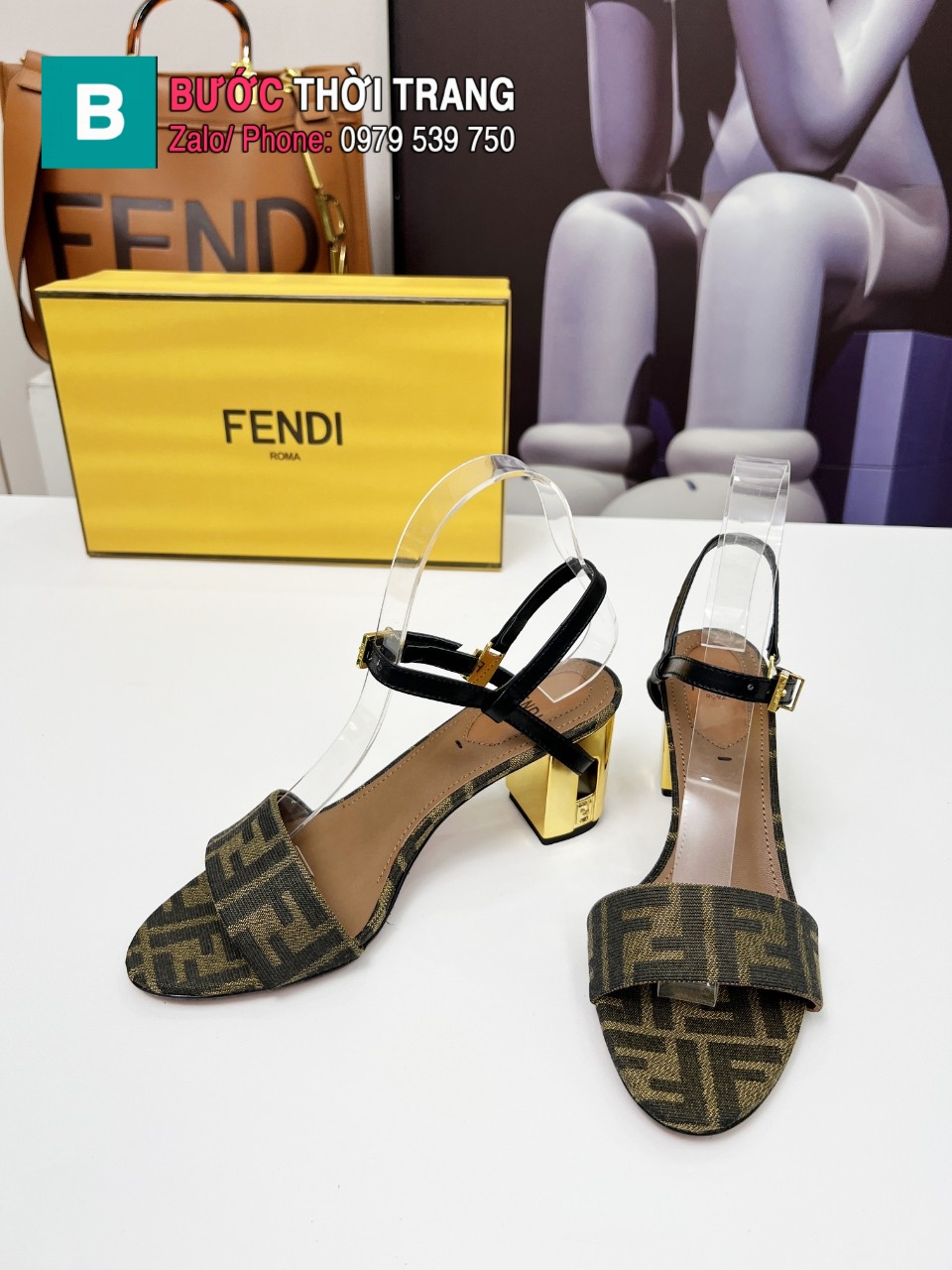Sandal cao gót FENDI màu nâu canvas thiết kế mũi tròn Delfina đặc trưng sang trọng
