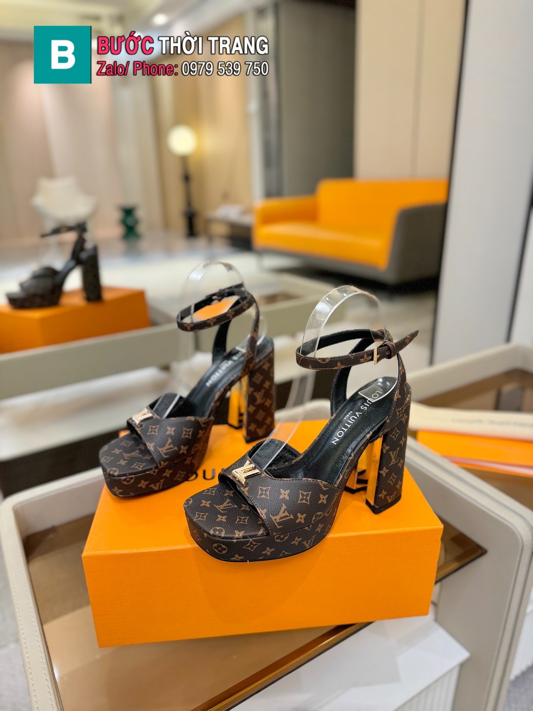 Sandal cao gót LV đế vuông màu nâu họa tiết monogram tôn dáng