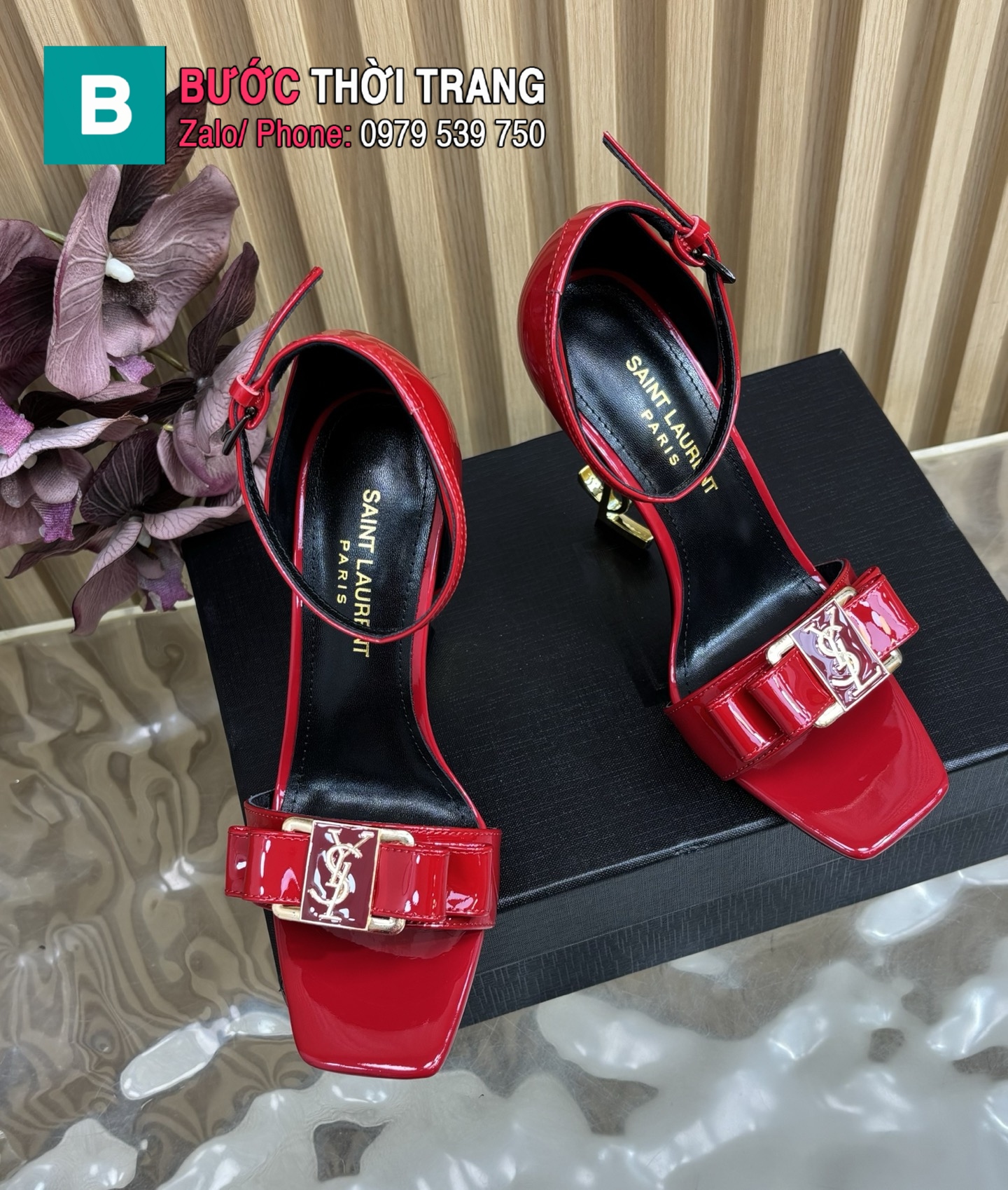Sandal cao gót YSL màu đỏ da bóng quai ngang nữ tính đế 11 cm tôn dáng