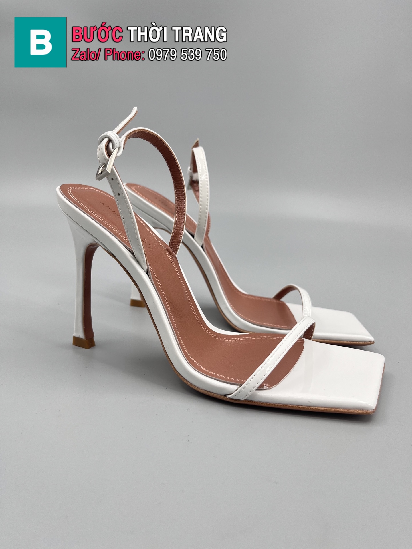 Sandan cao gót Amina Muaddi màu bạc bóng mũi vuông cao 9.5cm
