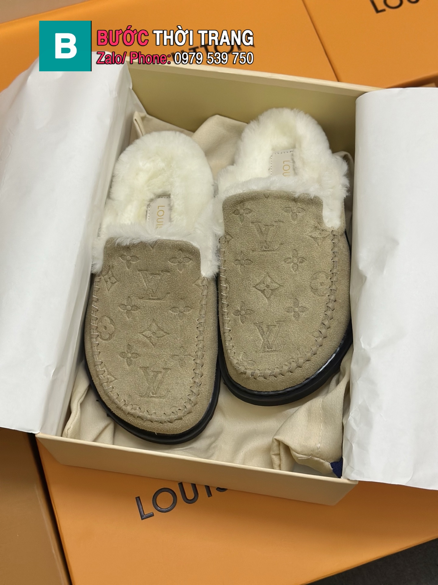 Sục LV lông cừu cao cấp màu be nâu mềm êm ấm áp