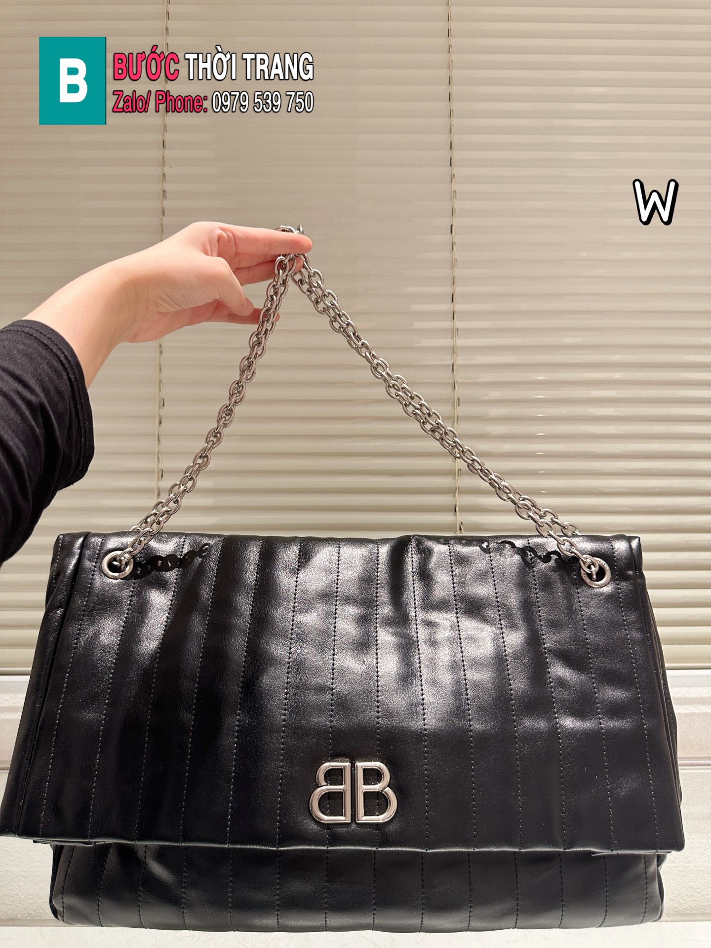 Balenciaga Monaco dòng quilted mới ra mắt, bản phối đen bạc sang trọng với thiết kế nắp gập và dây đeo kim loại cực thời thượng. Chất liệu da bê siêu mềm, bề mặt mịn và mềm mại như da cừu, cầm rất thích tay. Khoang túi rộng rãi, lót vải chắc chắn nên không lo trầy xước khi sử dụng. Logo BB kinh điển nổi bật, kết hợp với phần thân túi phồng mềm tạo nên cảm giác phóng khoáng, hơi “bụi” nhưng rất thời trang và cá tính.