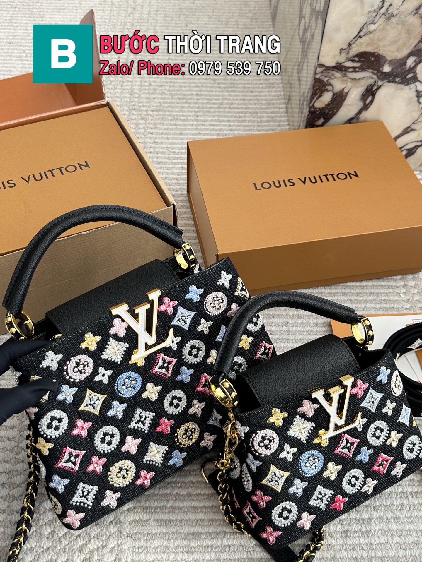 Túi xách cầm tay LV capucines màu đen size 20 cm và 27 cm họa tiết monogram lấp lánh nổi bật